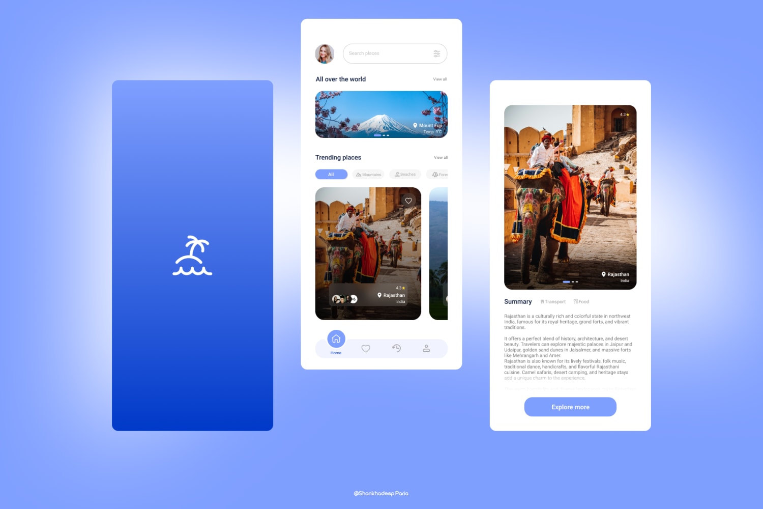 A minimal and visually soothing travel app UI design that focuses on smooth navigation and user-friendly flow. The project includes a loading screen, home page with travel place cards, and a summary page where users can explore destinations in detail using an intuitive “Explore More” feature.