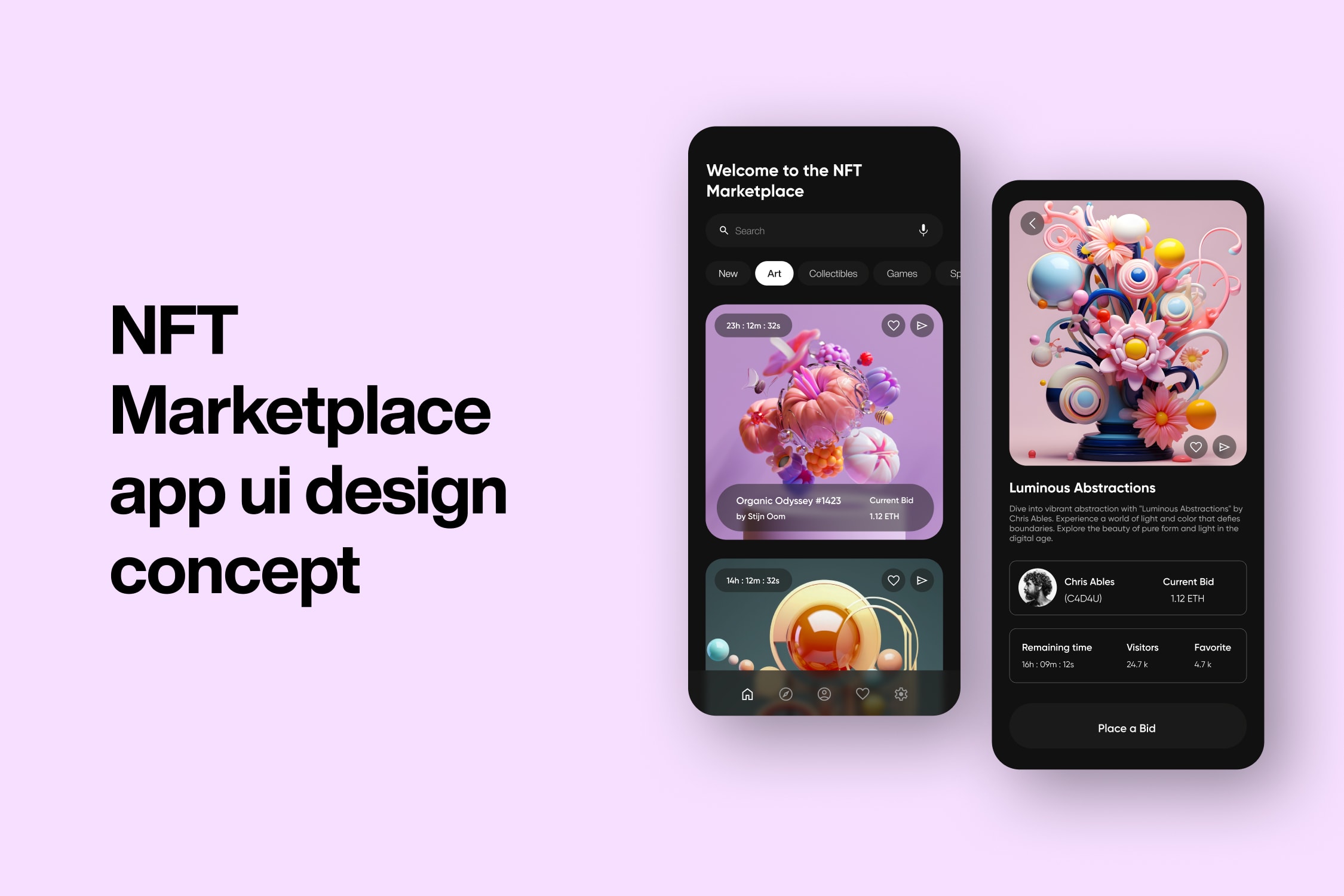 This is a modern and sleek UI design concept for an NFT marketplace mobile app. The design focuses on delivering an intuitive browsing experience where users can easily explore, bid, and manage their digital art collections. The goal was to create a visually appealing and user-friendly interface that enhances the NFT buying and selling experience.