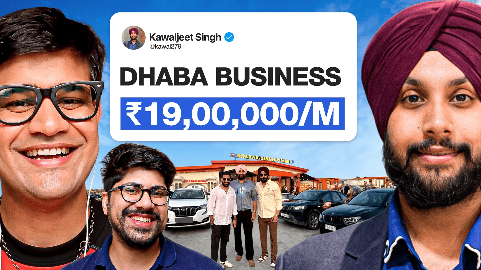 My thinking was simple. The strongest hook in this episode is the income from a dhaba franchise. People click when they see a surprising money number connected to a normal business. So I made the money number the main focus of the thumbnail. The text is large simple and easy to read on mobile. I avoided too many words and focused on the core curiosity. Kawaljeet Singh is clearly visible because the credibility of the story comes from him. I also kept the hosts visible because returning viewers recognize them and it builds familiarity. The dhaba location and cars in the background give quick context and show that this is a real physical business. I used strong color contrast so the number stands out in the feed.