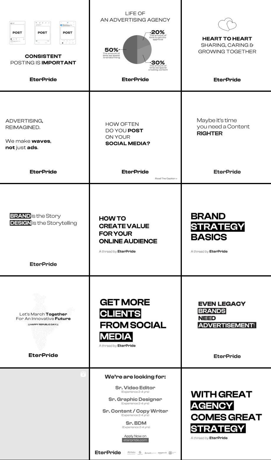 As the initial point of contact for potential clients, producing content for the agency where you work is interesting and engaging. As a junior and only copywriter in the agency, I got the opportunity to build social media into an eye-catching platform by delivering informative and creative content that brings engagement and connects with the audience.