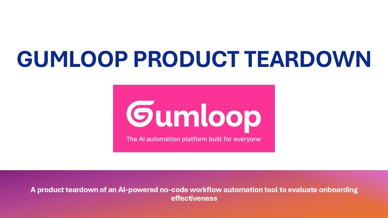 The objective of this project was to conduct a product teardown of Gumloop, an AI-powered no-code workflow automation platform, to evaluate the effectiveness of its onboarding experience and identify opportunities to improve user activation and retention. The project involved analyzing the end-to-end user journey, mapping key onboarding steps, identifying friction points, and studying the product’s growth mechanics such as prompts, guidance patterns, and feature discovery flows. I applied product thinking frameworks, UX analysis, and activation metrics to propose data-backed recommendations aimed at reducing drop-offs and improving first-time user success. This was an independent product case study completed to strengthen my skills in product teardown, user journey analysis, and growth strategy. This was an independent product case study completed to strengthen my skills in product teardown, user journey analysis, and growth strategy.