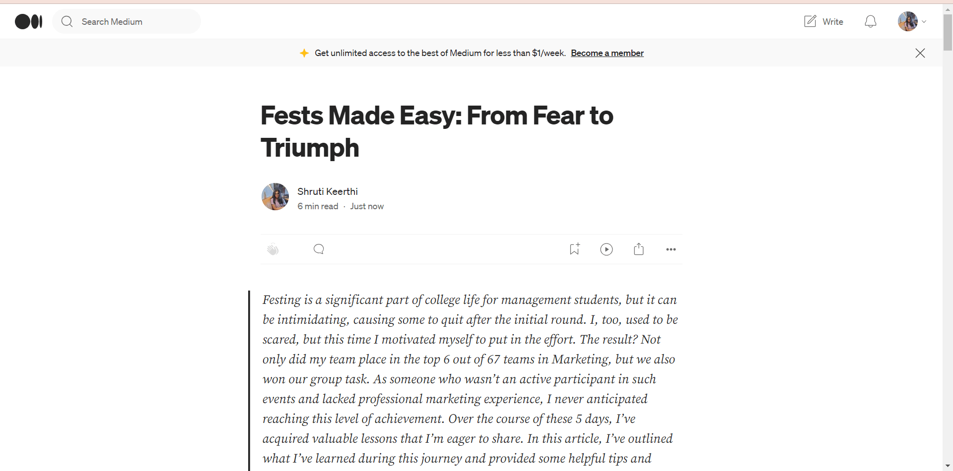 Over the course of these 5 days, I’ve acquired valuable lessons that I’m eager to share. I’ve posted an article "Fests Made Easy: From Fear to Triumph" on Medium where, I've outlined what I've learned during this journey and provided some helpful tips and strategies for excelling in any fest, with a particular focus on Marketing and Group Task.