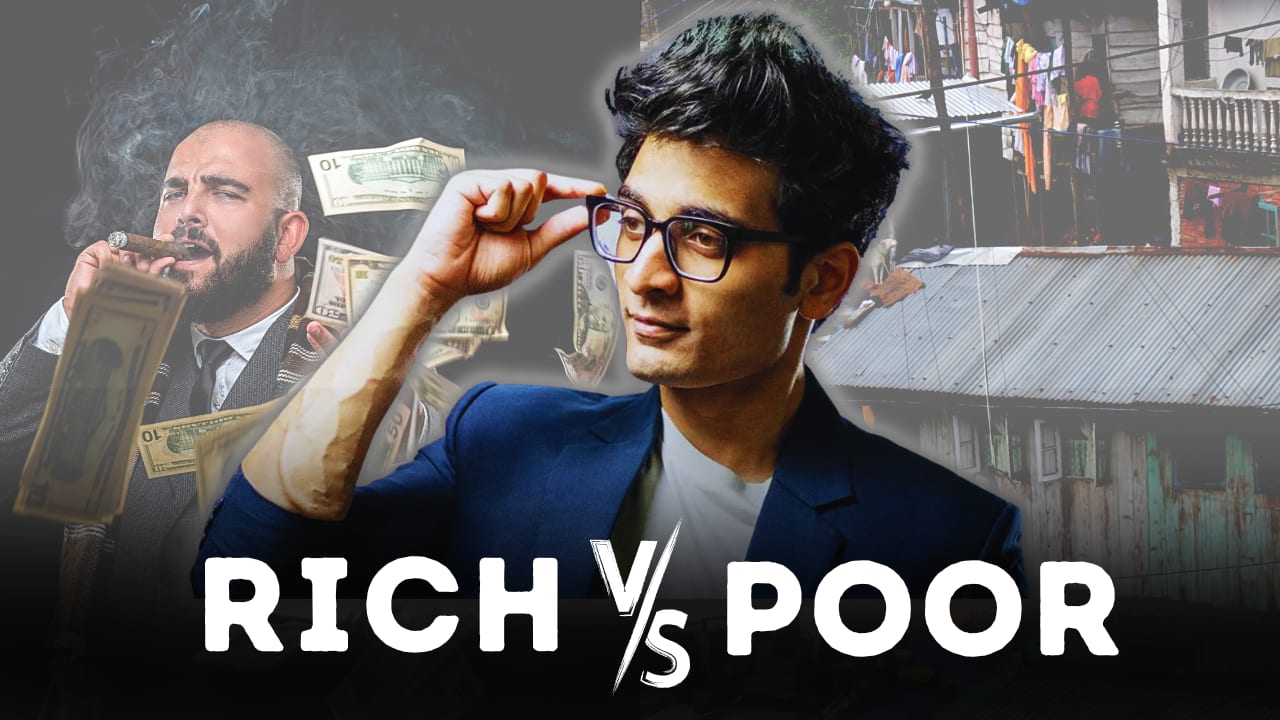 This is the thumbnail I've designed for one of the video of varun mayya about Rich vs poor. I've designed this in canva using minimal elements and editing.