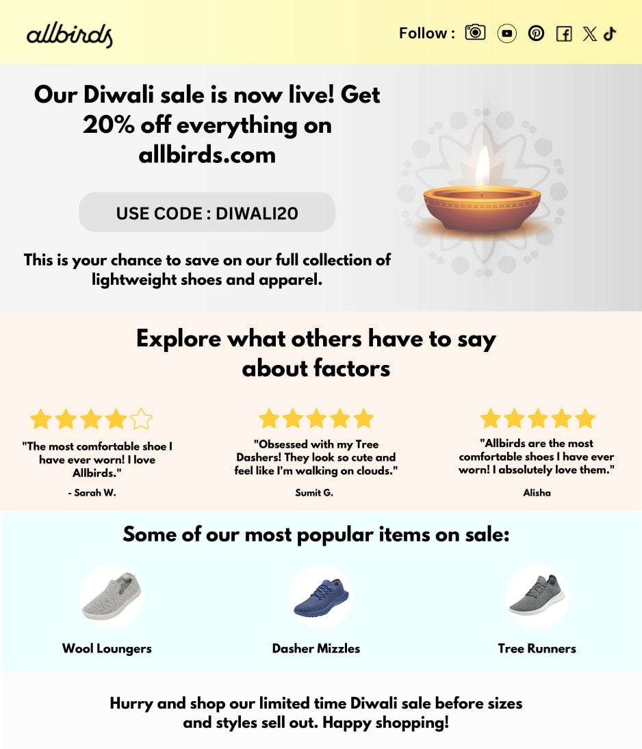This emailer was created as part of a Diwali promotional campaign for Allbirds. The goal was to design a visually appealing and festive email that effectively promotes a 20% discount on their entire collection. The layout highlights the offer with a clear call-to-action (CTA), showcases customer reviews to build trust, and features popular products to drive conversions.