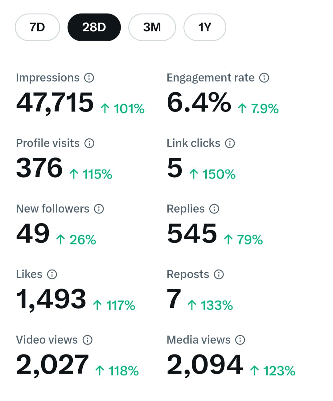 Hey, I recently achieved a remarkable 101% surge in profile reach on X for one client within just one month. On Instagram, I achieved a 5400% surge for the non-followers and a 147% surge for the followers in a ratio of 87%: 13% within less than two weeks.