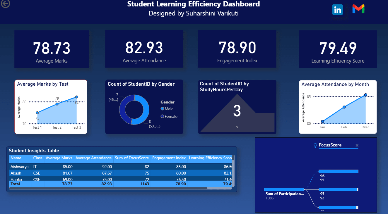 This dashboard analyzes student performance based on marks, attendance, study hours, and behavioral metrics.