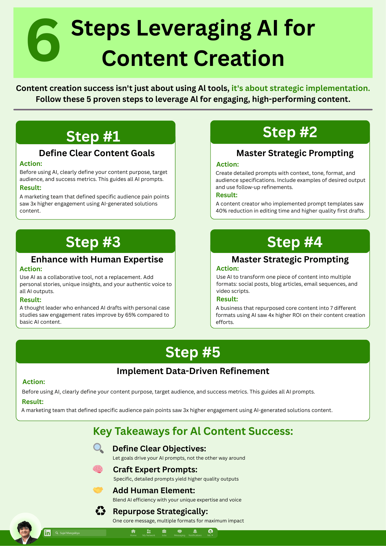 Created a high-value AI Cheatsheet Carousel for LinkedIn to simplify complex AI tools and workflows for beginners and content creators. The goal was to make AI tools more accessible through clean, engaging, and informative visuals.