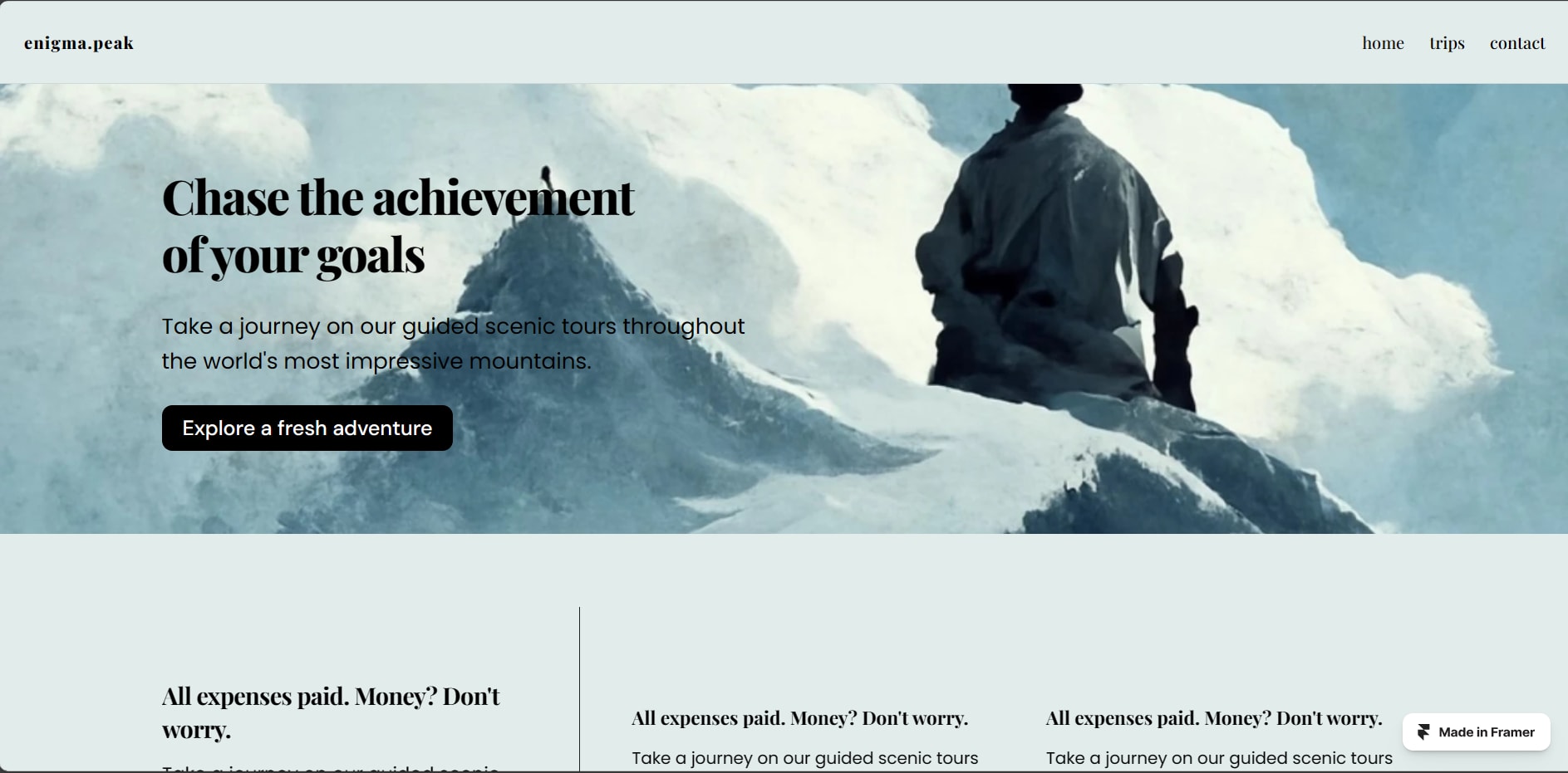 Embark on a journey to conquer your goals with Enigma Peak, a beautifully crafted web design project created with Framer. Explore the heights of achievement and unlock your true potential.