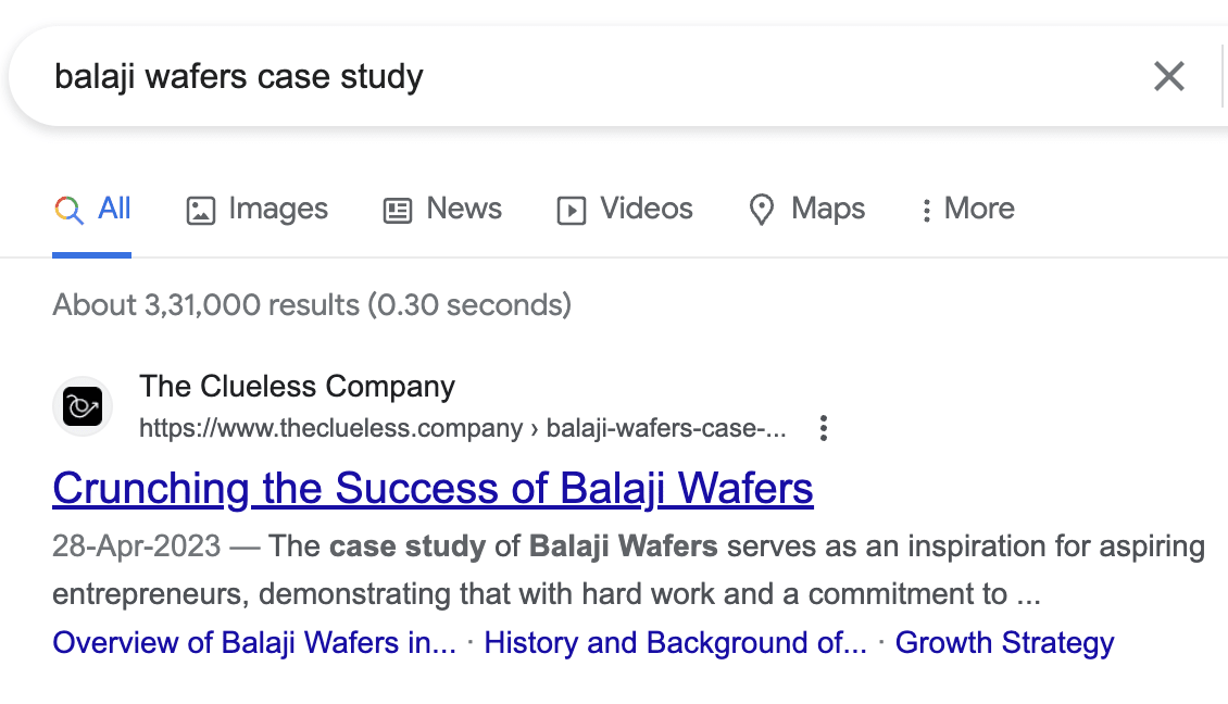 Discover the unrivaled expertise of The Clueless Company as their blog dominates Google's search results with an insightful Balaji Wafers Case Study. Uncover the secrets behind Balaji Wafers' success and gain valuable industry insights for your own business triumphs.