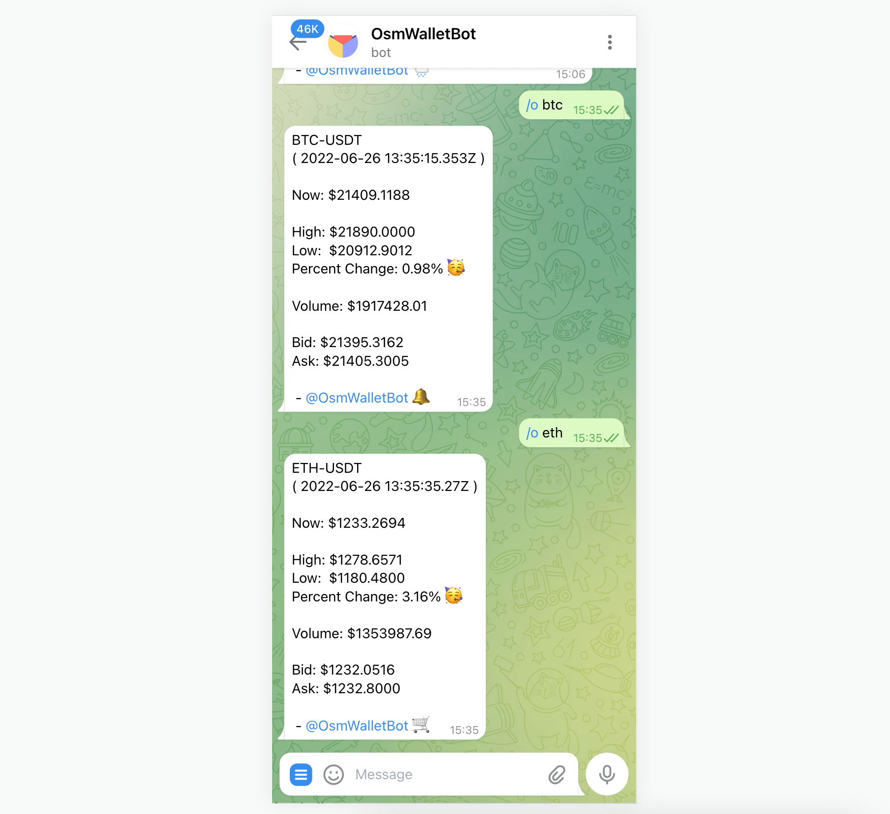 Step 3: To query the bot for price, use following commands: