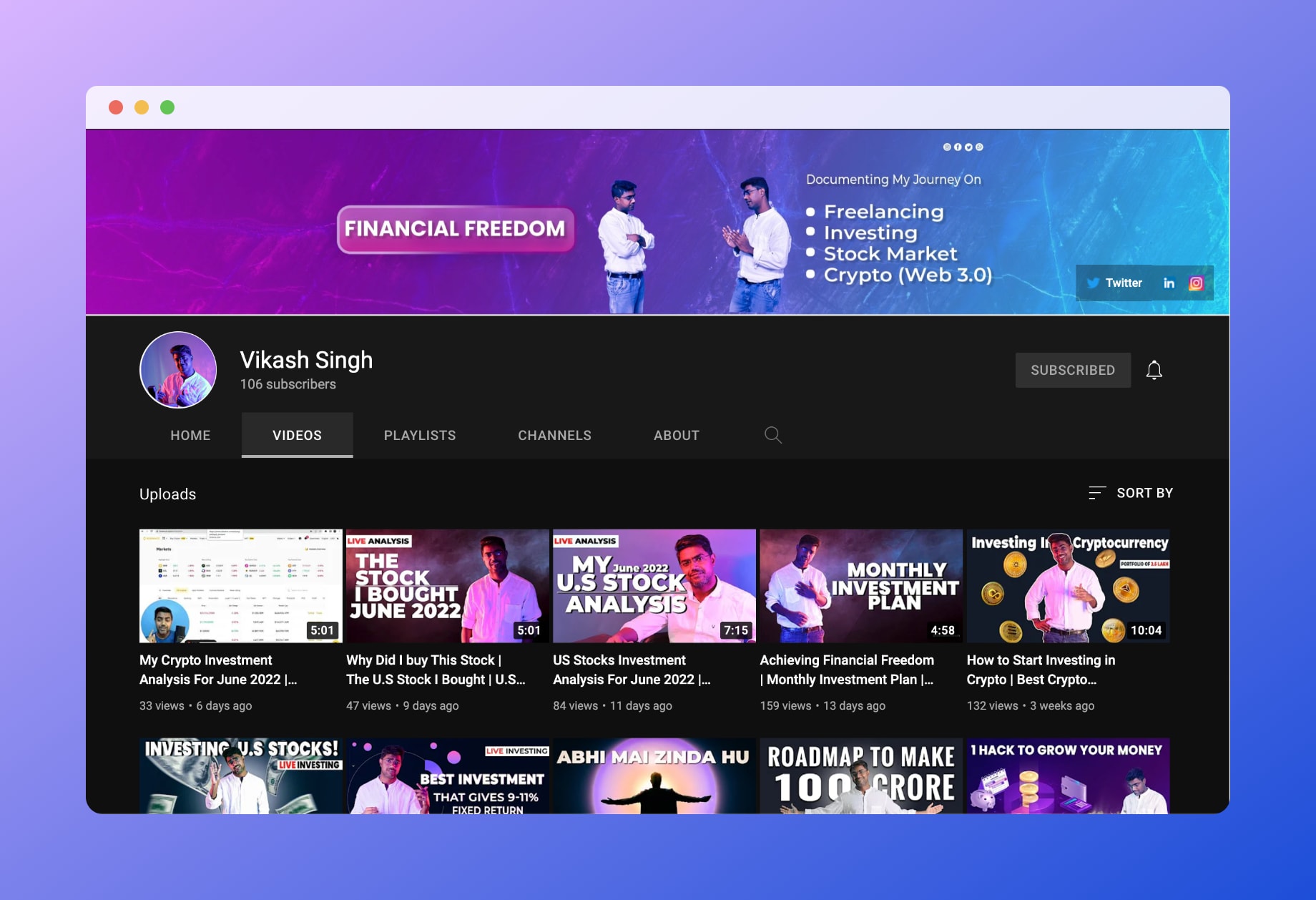 On this channel, I'm documenting my Freelance Journey | My all Personal Investment (Ideally in Stock Market in U.S Stock Market, in Cryptocurrencies, in NFT in Web 3.0) | How I'm l Building 7 Figure Agency | My failure and my success along the way.