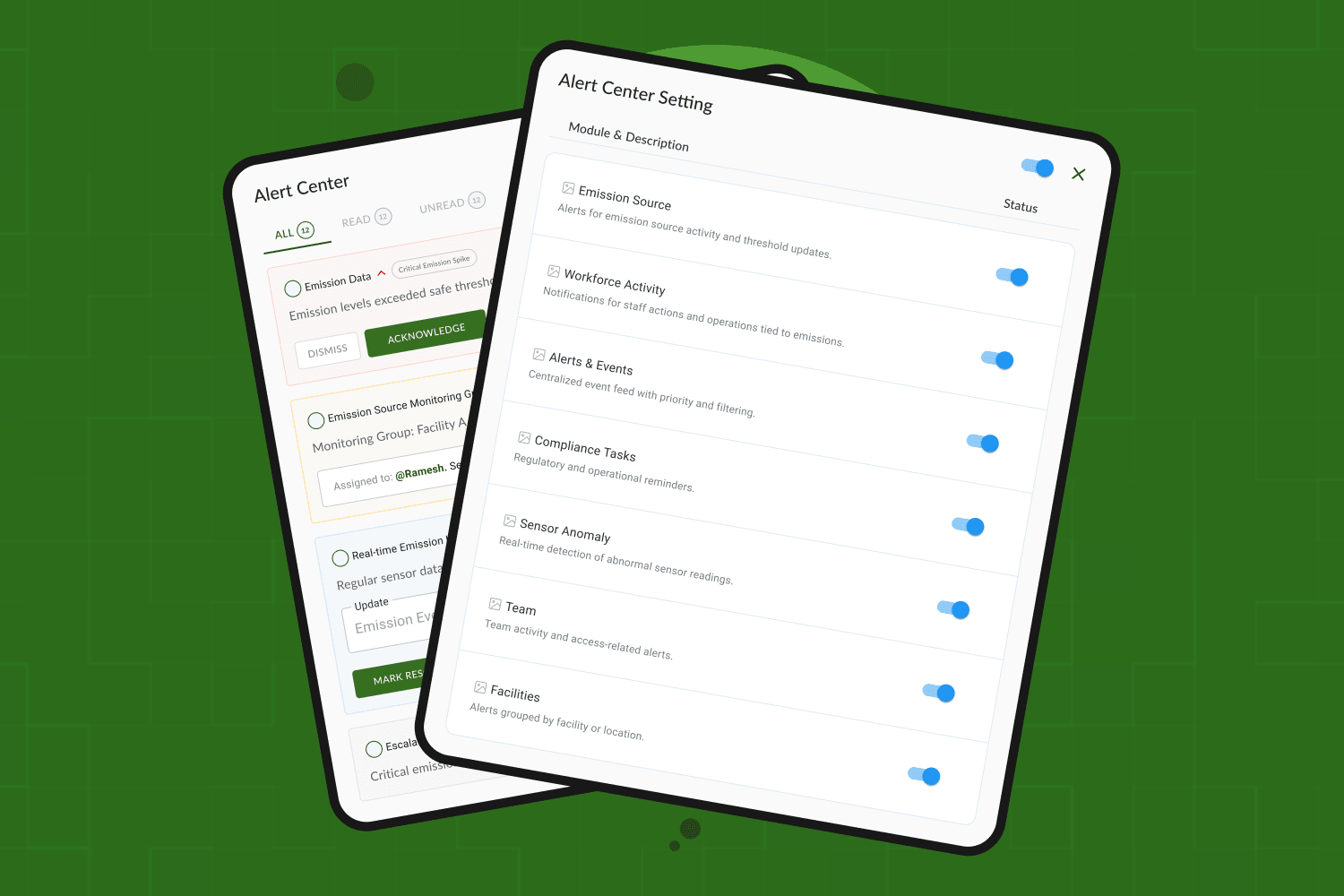 A centralized alert hub designed to make critical emission events clear, actionable, and fast to respond to. It brings scattered alerts from sensors, compliance checks, and facilities into a single structured feed. Carbon monitoring platforms generate critical alerts across different sources emission spikes, system warnings, compliance reminders but these alerts are often scattered across emails, dashboards, or chat threads. This fragmentation leads to missed alerts, slow response times, and poor visibility on what actually matters.