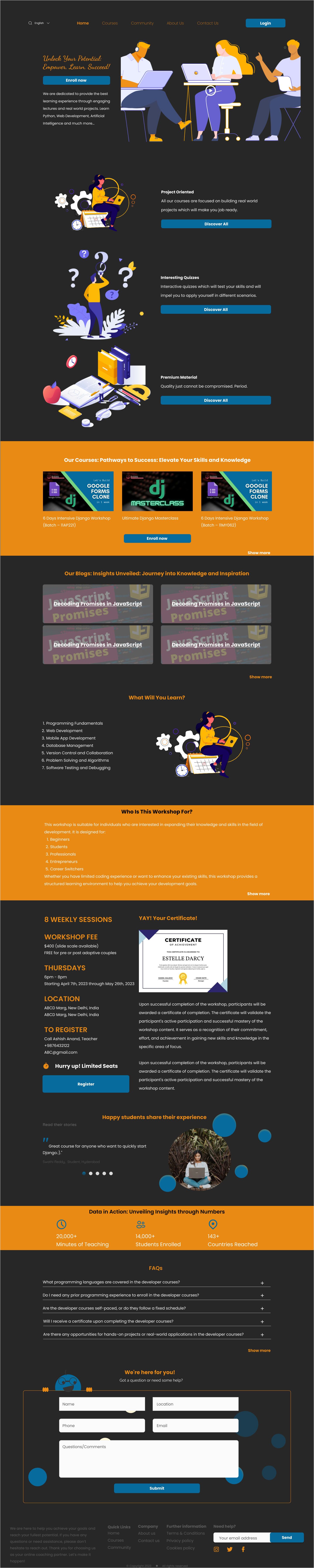 To facilitate the enrollment process, a user-friendly registration form is strategically placed on the landing page. The form captures essential information from prospective students, allowing them to express their interest and take the next steps. Additionally, prominent contact information and a dedicated FAQ section are included, addressing any potential concerns or inquiries that visitors may have.