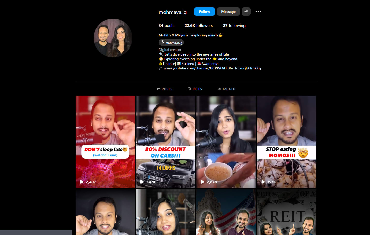 I've professionally edited over 30 reels for Mohmaya, seamlessly executing green screen removal and incorporating elements such as graphics, relevant photos, and strategic sound effects to achieve a polished and sophisticated appearance.