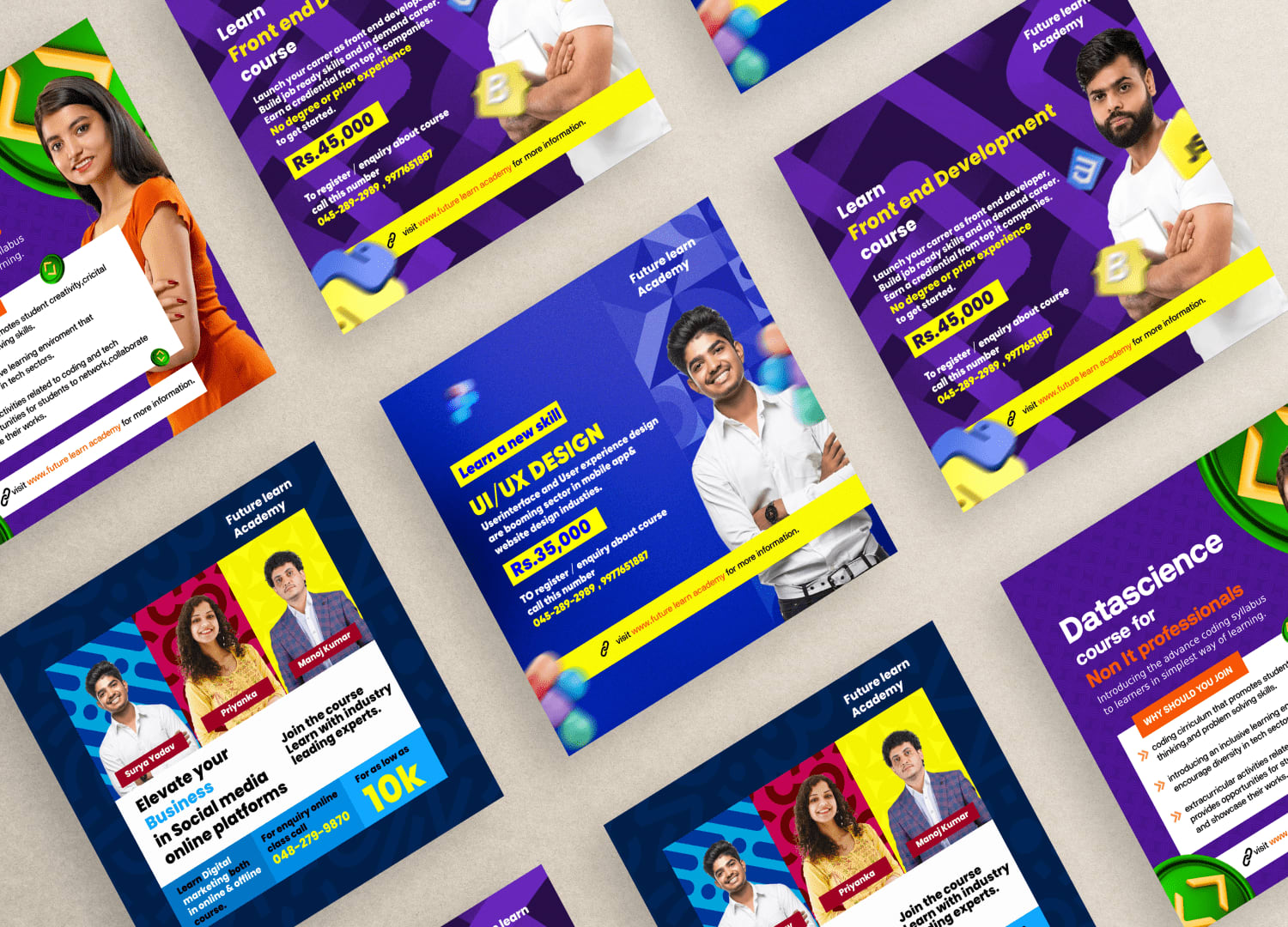future learn academy social media post design banner about the courses offered in UI/UX, digital marketing, data science,front end development.