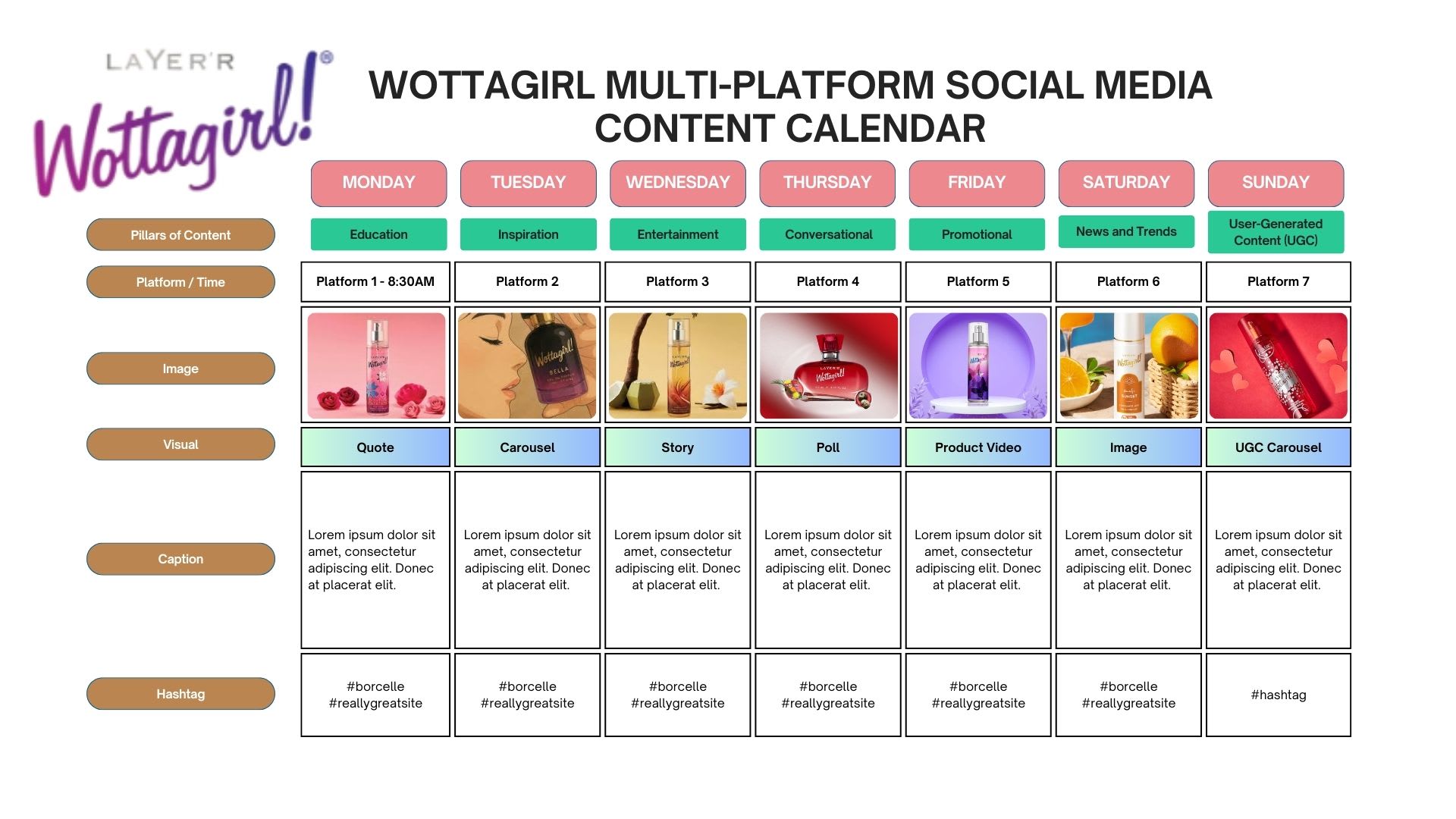 Since the official LinkedIn profile for Wottagirl was not available, I created an assumed professional strategy tailored for that platform. The LinkedIn calendar focuses on thought leadership, workplace culture highlights, industry insights, and partnership-driven posts, aligning with how a lifestyle and fragrance brand might position itself for professional networks.