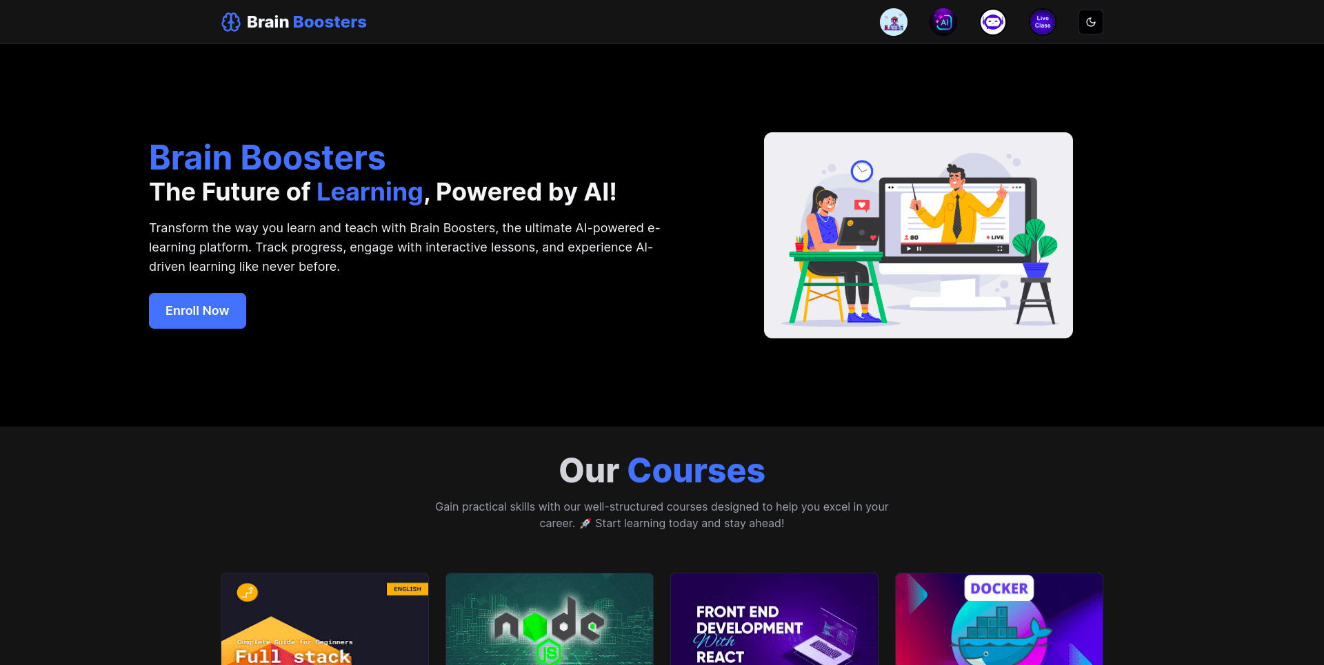 Brain Boosters is a full-stack e-learning platform built using the MERN stack, designed to simplify online learning and teaching. It allows creators to upload and sell courses, while learners can preview demo videos, purchase courses, and track their learning progress. The platform includes AI-powered tools like a code reviewer and chat assistant (powered by Gemini API), along with real-time live classes using ZegoCloud video calls. Integrated Razorpay for secure payments and implemented a CI/CD pipeline using GitHub and Render for seamless deployment.