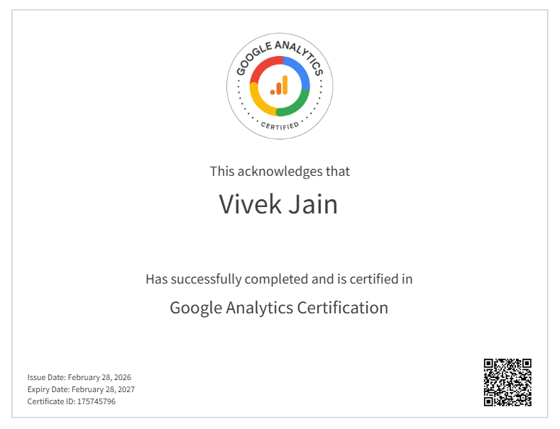 Certified in Google Analytics, showcasing the ability to analyze website traffic and marketing performance using data-driven insights. Experienced in tracking user behavior, setting up goals and events, analyzing reports, and using analytics to optimize marketing campaigns and improve conversions.