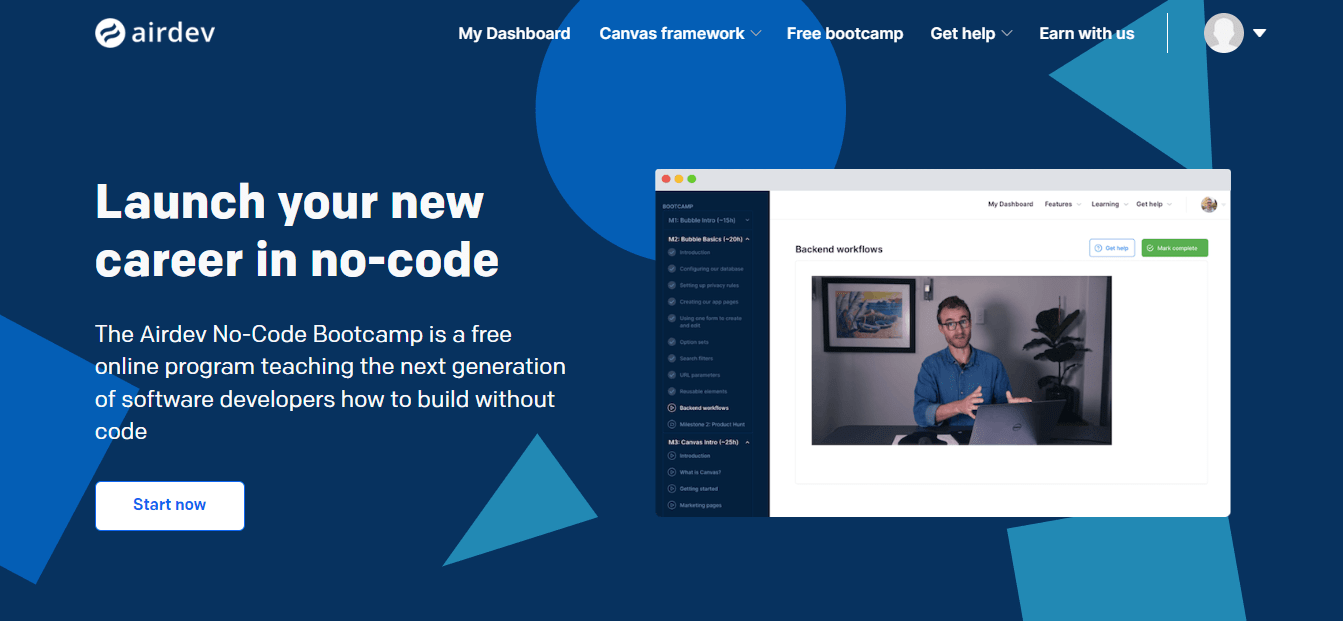 The Airdev No-Code Bootcamp is a free online program teaching the next generation of software developers how to build without code. I have built 5 project during the Bootcamp which has taught me all about Software Development Principles and the nuances of the most popular platform, Bubble.io. Learned about the Database setup, Performance and security best-practices, and Responsive design.